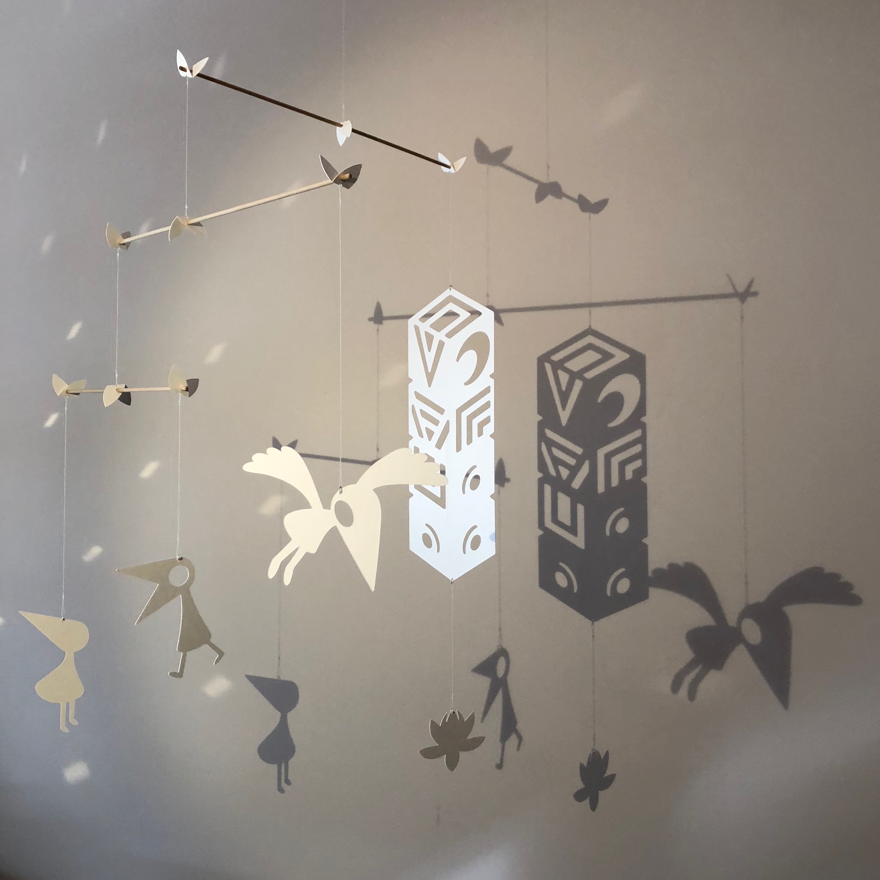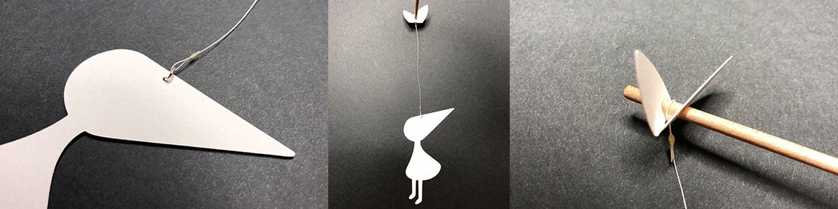 I like the idea of a hanging mobile, the movement from the air in the room and the equilibrium of each part. But I quickly found how tricky it was to drill exact holes into dowels. If the holes are not 100% right, it won’t be balanced and just look wrong. I needed something more flexible and came up with the “moveable leaf” seen below. The leaf can easily be moved to the right spot and still fit into my mantra of Simple & Elegant.
